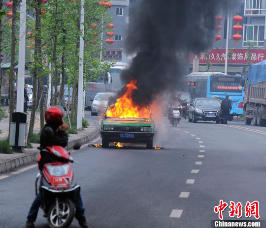 4月10日,四川乐山城区肖坝路乐山职业技术学院外一辆出租车在行驶中突然起火燃烧,驾驶员将车停下后逃离并报警。图为一位市民停车查看起火的出租车。刘忠俊 摄