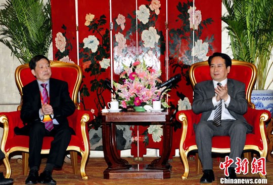 4月10日,国务院侨办副主任谭天星在北京会见了以旅荷华侨总会会长潘世锦为团长的旅荷华侨总会中青年侨领参访团一行。中新社发 张勤 摄