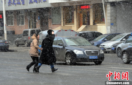 4月10日,哈尔滨天空时晴时阴,雪花也时断时续地飘落,偶尔会赶上晴空飘雪,景象很是新奇。中新社发 胡迪 摄