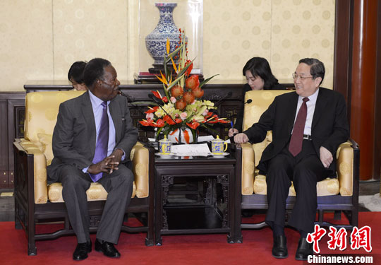 4月10日,中国全国政协主席俞正声在北京钓鱼台国宾馆会见了赞比亚总统萨塔。中新社发 刘震 摄