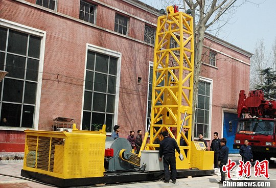 4月10日,冀中能源石煤机公司员工正演示新研发的可视化救援提升设备JT-40Y。当矿难发生时,在钻机车快速完成救援孔施工后,救援人员利用该设备,将救援舱快速下放到井下,把受困人员安全提升到地面。中新社发 翟羽佳 摄