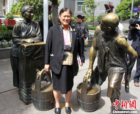 4月10日,泰国公主诗琳通参观武汉江汉路步行街,在具有武汉特色的雕塑前留影。当日,诗琳通公主来到她翻译成泰文的武汉作家池莉的小说《她的城》中涉及的主要街道景点,如前进五路、江汉路、胜利街等,感受小说中描绘的武汉风情,体验武汉市井文化。中新社发 张畅 摄