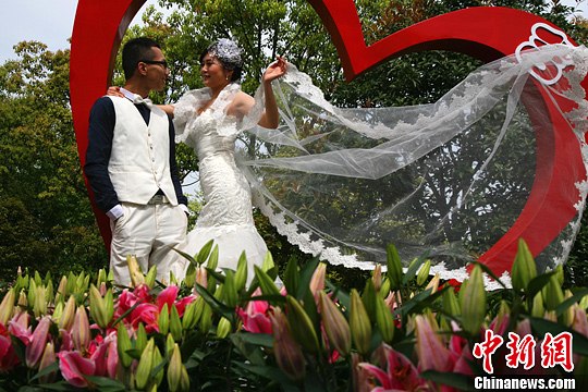 4月10日,2013中国杭州·西溪花朝节正式开幕,西溪国家公园内一对新人在这花的海洋中拍婚纱照。中新社发 李晨韵 摄
