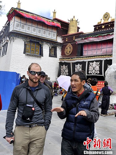 4月10日,拉萨大昭寺广场上,导游正在给外国游客讲解。进入4月,拉萨旅游逐渐升温,国内外游客开始进入拉萨。中新社发 李林 摄