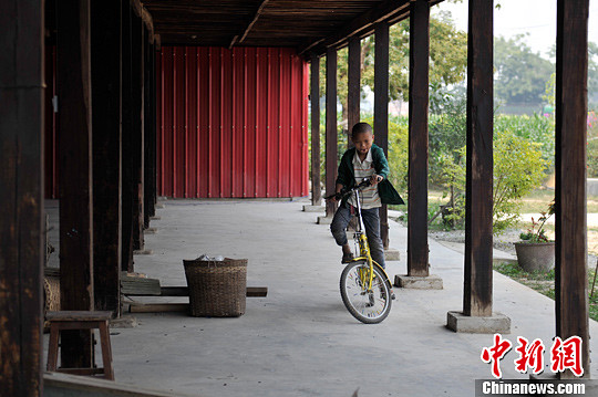 4月9日,云南省瑞丽市姐相乡小等喊弄奘寺外,在骑车玩耍的小沙弥。中新社发 刘冉阳 摄
