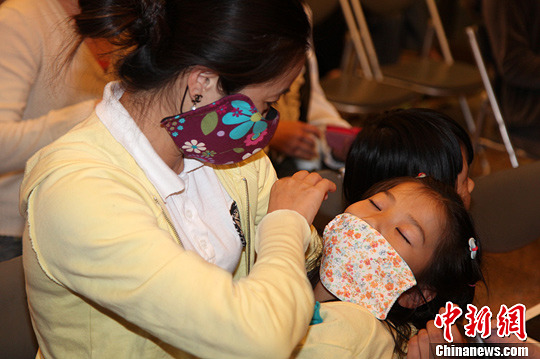 4月10日晚,台湾H7N9流行疫情指挥中心公布最新统计数字,截至10日下午5时,已排除41人感染H7N9禽流感,台湾维持零病例,另有5个疑似病例在检验中。图为从台湾南部来到台北的一对母女,女儿睡着了,仍戴着口罩。中新社发 董会峰 摄