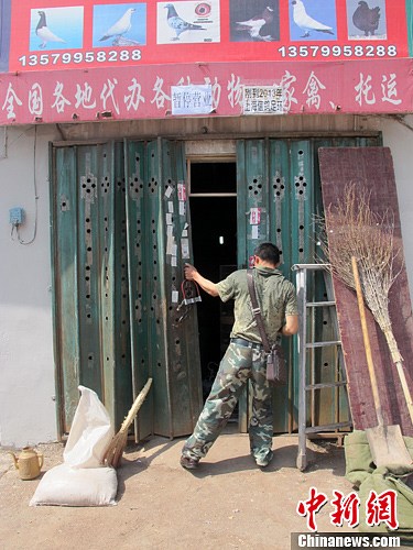 4月16日,记者在新疆乌鲁木齐华凌市场看到,为防控H7N9禽流感疫情,乌鲁木齐唯一鸟市——华凌鸟市已被乌鲁木齐市林业局联合相关部门要求暂停交易。中新社发 杨喆 摄