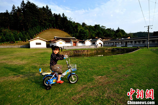 4月17日,一小女孩在吴伯雄祖祠前的草地上骑车玩耍。中新社发 王东明 摄