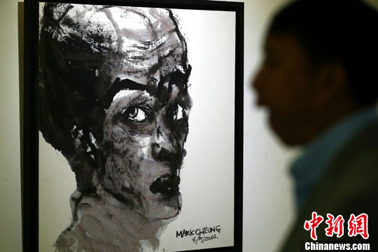 4月27日,时装设计师张肇达在北京798举办“太物-张肇达水墨画展”,此次展出数十幅作品分为人物作品和抽象水墨作品两大类,展览将持续到5月4日。中新社发 富田 摄