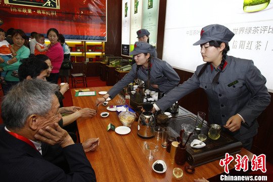 4月28日,在中国信阳第21届国际茶文化节上,将军县新县的茶叶展位上,身着红军服饰的姑娘请参展者品尝毛尖。中新社发 王中举 摄