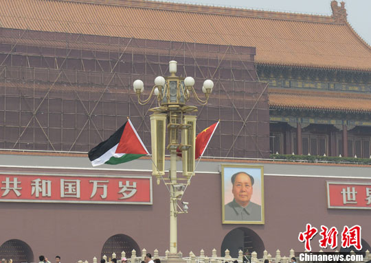 5月6日,天安门前悬挂着巴勒斯坦国旗,以示欢迎巴勒斯坦国总统阿巴斯来华访问。这是阿巴斯首次以总统身份来华访问。中新社发 侯宇 摄