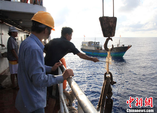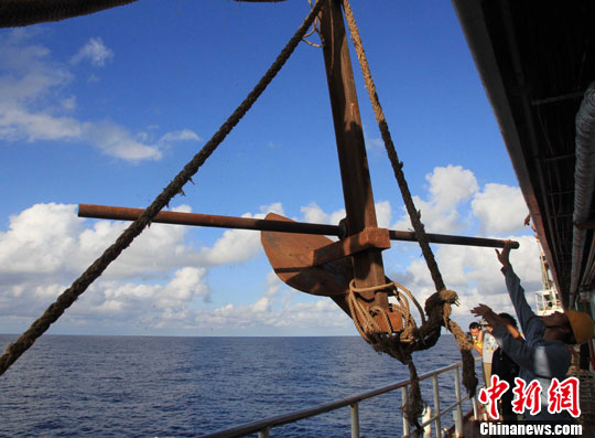 5月13日下午16时45分,在不间断航行近173个小时后,海南赴南沙捕捞船队顺利抵达南沙作业海区。船队在北纬6度01分、东经108度48分抛锚停泊。图为船员备锚,该锚重达1200余斤。中新社发 王晓斌 摄