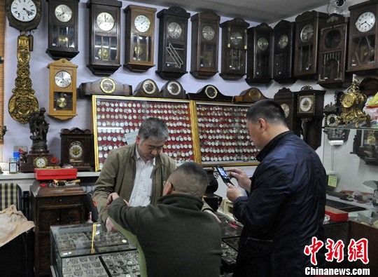5月21日,哈尔滨“顺时钟表”店内“表王”王英伟在向客户展示他收藏的手表。中新社发 胡迪 摄