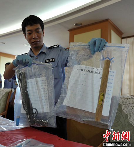 图为警方缴获的疑犯作案时的雷明登霰弹枪、铁锤工具。中新社发 黄耀辉 摄