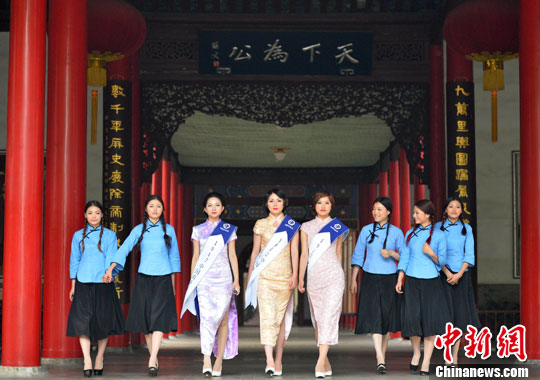 5月23日,一场以探讨民国文化和商业融合发展为主题的论坛在南京“总统府”内举行。图为身着浅蓝色褂子与黑色裙子的大学生和身着中式旗袍的靓丽模特在会场外惊艳亮相。中新社发 泱波 摄