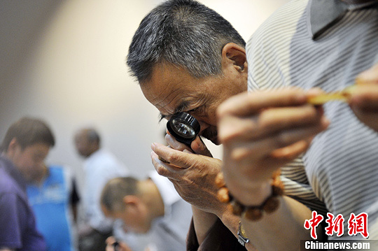 5月24日,在山西省民俗博物馆,收藏爱好者鉴定购买文物。当日,中国文物艺术品交流会在山西太原举行,吸引了众多收藏爱好者的关注。中新社发 韦亮 摄