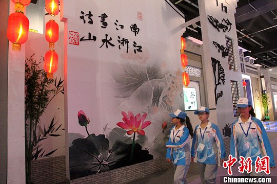 图为第五届旅博会志愿者从“诗画江南 山水浙江”牌坊前走过。张茵 摄