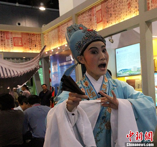 图为来自浙江绍兴的戏曲表演者向游客现场表演越剧。张茵 摄