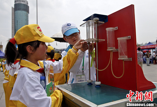 图为贵阳市的小学生在活动现场体验小型“虹吸”装置。中新社发 李桐 摄