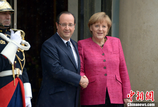 图为奥朗德与默克尔在进入爱丽舍宫会谈前握手。中新社发 龙剑武 摄