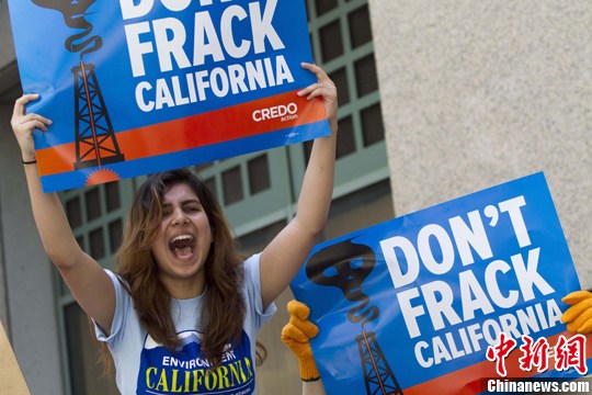 当地时间5月30日,美国加利福尼亚州洛杉矶市中心,一批农民、公共卫生专业人员、环保和消费者组织代表在州长办公室外抗议,敦促州长杰里·布朗禁止以水力压裂法(fracking)钻掘加州石油。中新社发 林戈 摄