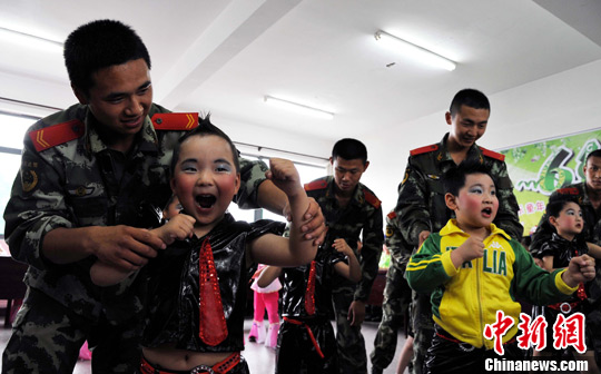 5月31日,武警合肥市支队十一中队的战士教小朋友擒拿术。中新社发 韩苏原 摄