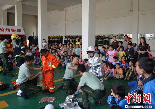 图为孩子们走进遂宁消防支队体验消防员的辛苦生活。中新社发