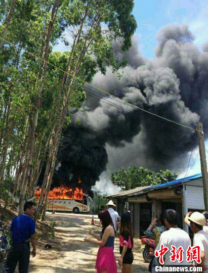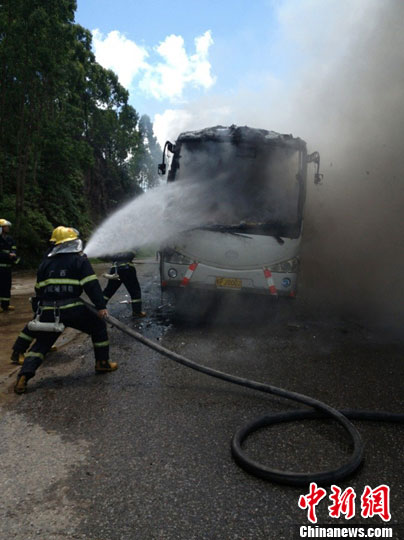 5月31日13时30分许,一辆由广西东兴开往北海的客车在广西防城港东兴市滨海公路松柏边防派出所附近发生自燃,车上20多名乘客通过自救脱困,其中两人受轻伤。冯抒敏 摄