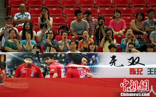 图为现场球迷为王皓陈玘组合加油。姜涛 摄