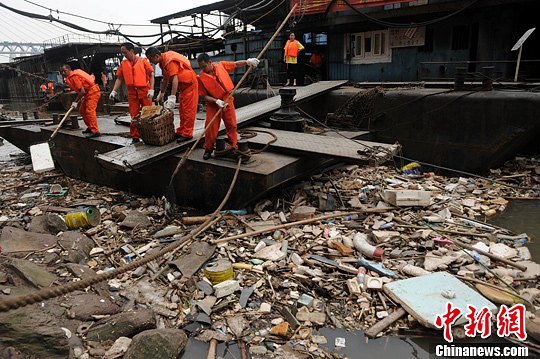 6月5日,世界环境日,重庆环卫工人来到长江重庆段开展水域清漂,保护江水环境。中新社发 陈超 摄
