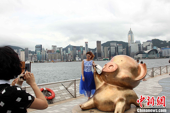 6月5日,访港游客兴致勃勃在“星光大道”上与香港本土卡通“麦兜”的铜像留影。星光大道是为了表扬香港电影业界的杰出人士的特色景点,仿效美国荷里活星光大道打造而成。中新社发 洪少葵 摄