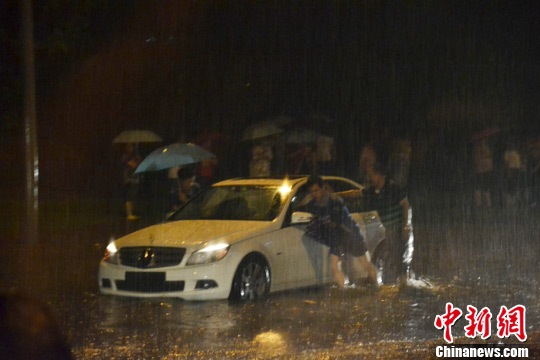 图为一辆汽车通过积水较深路段时熄火,司机下车推行汽车。刘相琳 摄