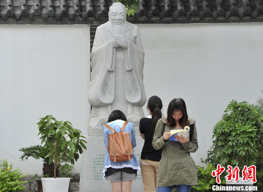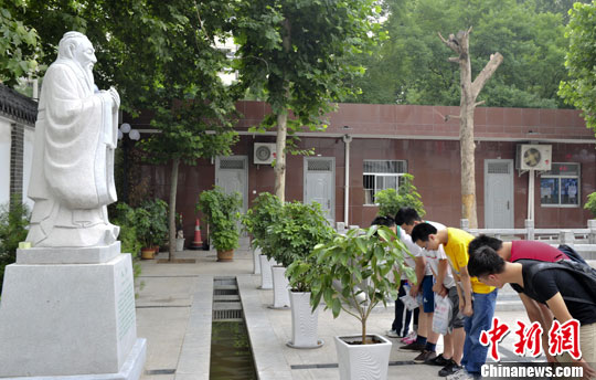 6月8日,在济南一高考点院内,许多考生考前拜孔子像,祈求高考英语能出好成绩。中新社发 张勇 摄
