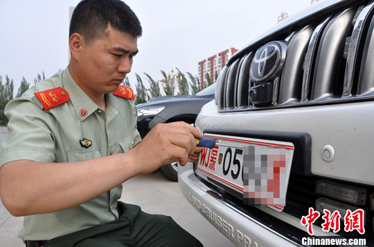 6月7日下午,内蒙古通辽市举行发放车辆新式牌照仪式,将“07”式旧牌照进行了收缴、销毁,各旗、县、市、区消防部队车辆将陆续全部更换新式牌照。图为通辽市消防支队的一名士官正在安装新式牌照。中新社发 张猛 摄