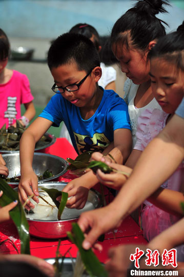 6月9日,沈阳市铁路第三小学的学生包粽子庆祝端午节的到来。中新社发 于海洋 摄