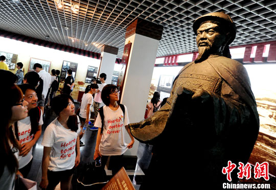 图为参观者被中国船政文化博物馆内展出的清代首任船政大臣沈葆桢雕塑所吸引。中新社发 刘可耕 摄