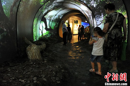 6月9日,市民行走在森林博物馆内的4D森林主题通道。4D森林主题通道采用场景和多媒体环幕相结合的形式,使您仿佛置身于森林之中,全身心的感受森林的清新呼吸、自然节律和生态之美,体验森林不同季节的变化。中新社发 胡迪 摄