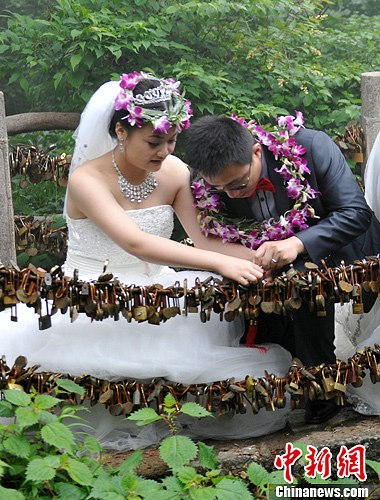 6月9日,来自全国各地的20对新人在黄山许下爱的山盟,旅途中穿着婚纱喜结连理。中新社发 张娅子 摄