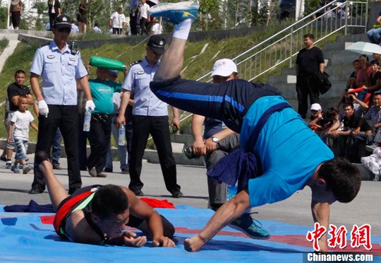 新疆伊犁哈萨克自治州第十七届阿肯阿依特斯文化旅游节16日在乌苏市开幕。图为传统体育竞赛中的摔跤比赛现场。闫文陆 摄