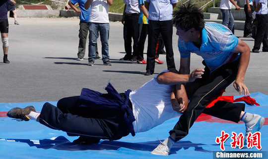 新疆伊犁哈萨克自治州第十七届阿肯阿依特斯文化旅游节16日在乌苏市开幕。图为传统体育竞赛中的摔跤比赛现场。王锡强 摄