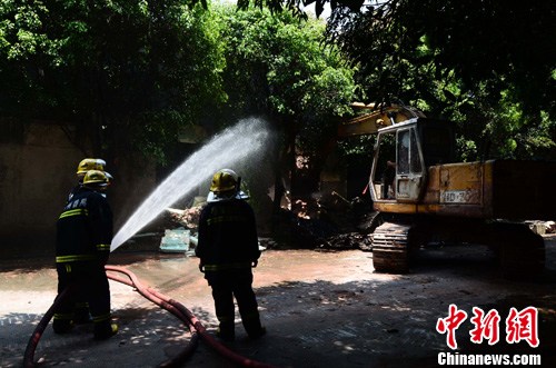 挖掘机在墙体和事发厂房墙壁,消防员往里喷水灭火。高荣权 摄