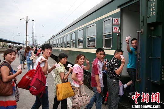 5210次列车旅客们正在展示最后一趟绿皮车车票。王起玉 摄