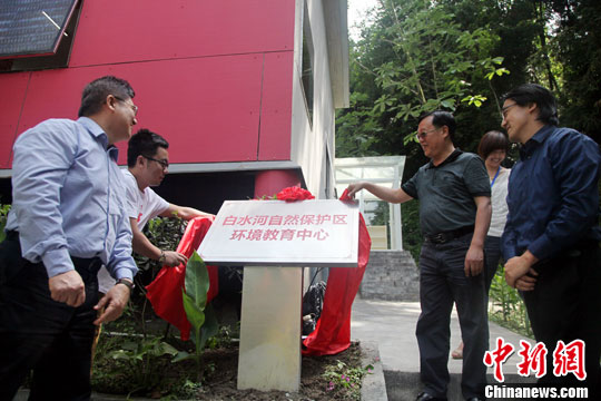 6月26日,离成都最近的野生大熊猫环境教育中心——“白水河自然保护区环境教育中心”落成。图为环境教育中学揭牌仪式现场。中新社发 钟欣 摄