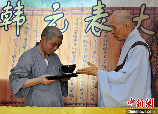 图为中韩佛教界人士互赠礼品。中新社发 吕巧琴 摄
