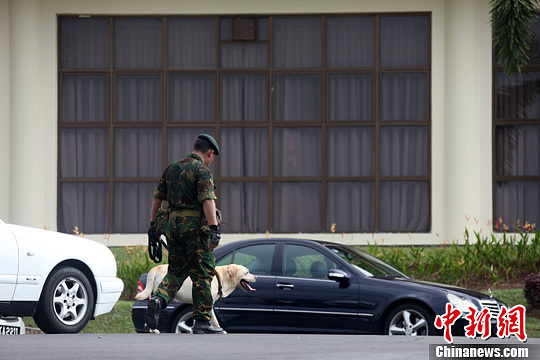 图为一名文莱军人带着嗅探犬在用作会场的国际会议中心周边巡逻。中新社发 张明 摄