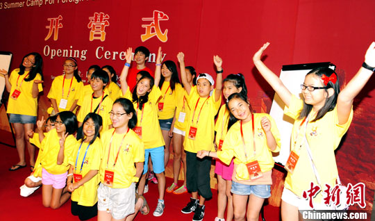 7月1日,“2013年领养中国儿童外国家庭夏令营”在北京举办开营仪式。图为营员在开幕式合影。中新社发 张勤 摄