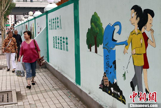 7月8日,经过哈二职美工专业10余名同学三天的巧手涂绘,哈尔滨南岗区宣化街与大成街交口周边的百余米工地围墙变身靓丽风景,“切勿闯红灯”、“不要随地吐痰”、“不要乱丢杂物”等10余幅文明宣传画跃然墙上。中新社发 胡迪 摄