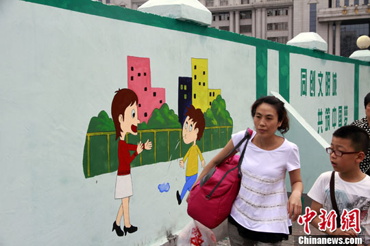7月8日,经过哈二职美工专业10余名同学三天的巧手涂绘,哈尔滨南岗区宣化街与大成街交口周边的百余米工地围墙变身靓丽风景,“切勿闯红灯”、“不要随地吐痰”、“不要乱丢杂物”等10余幅文明宣传画跃然墙上。中新社发 胡迪 摄
