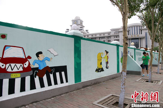 7月8日,经过哈二职美工专业10余名同学三天的巧手涂绘,哈尔滨南岗区宣化街与大成街交口周边的百余米工地围墙变身靓丽风景,“切勿闯红灯”、“不要随地吐痰”、“不要乱丢杂物”等10余幅文明宣传画跃然墙上。中新社发 胡迪 摄