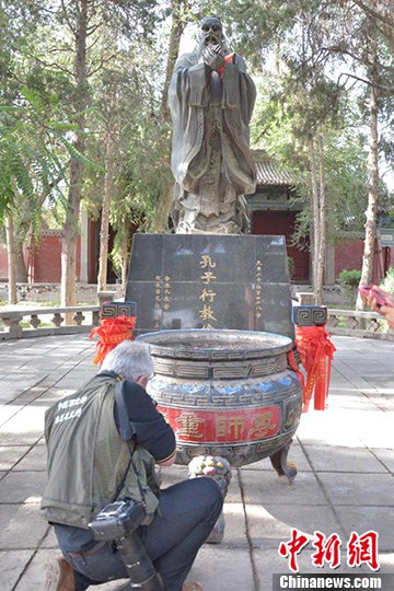 图为国外摄影师了解中国传统儒家文化,并用镜头拍摄孔子雕像。 崔琳 摄